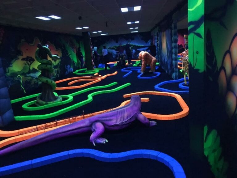 3-D Schwarzlicht – Minigolf Indoor Welt, ohne Brillen. Eine fantastische Welt aus Licht und Ton im Dschungel wartet darauf von dir entdeckt zu werden, reserviere gleich deine Spielzeit.