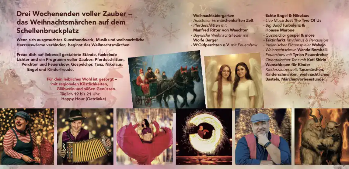 Freue Dich auf liebevoll gestaltete Stände, funkelnde Lichter und ein Programm voller Zauber: Pferdeschlitten, Perchten und Feuershow, Gospelchor, Tanz, Nikolaus, Engel und Kinderfreude…
